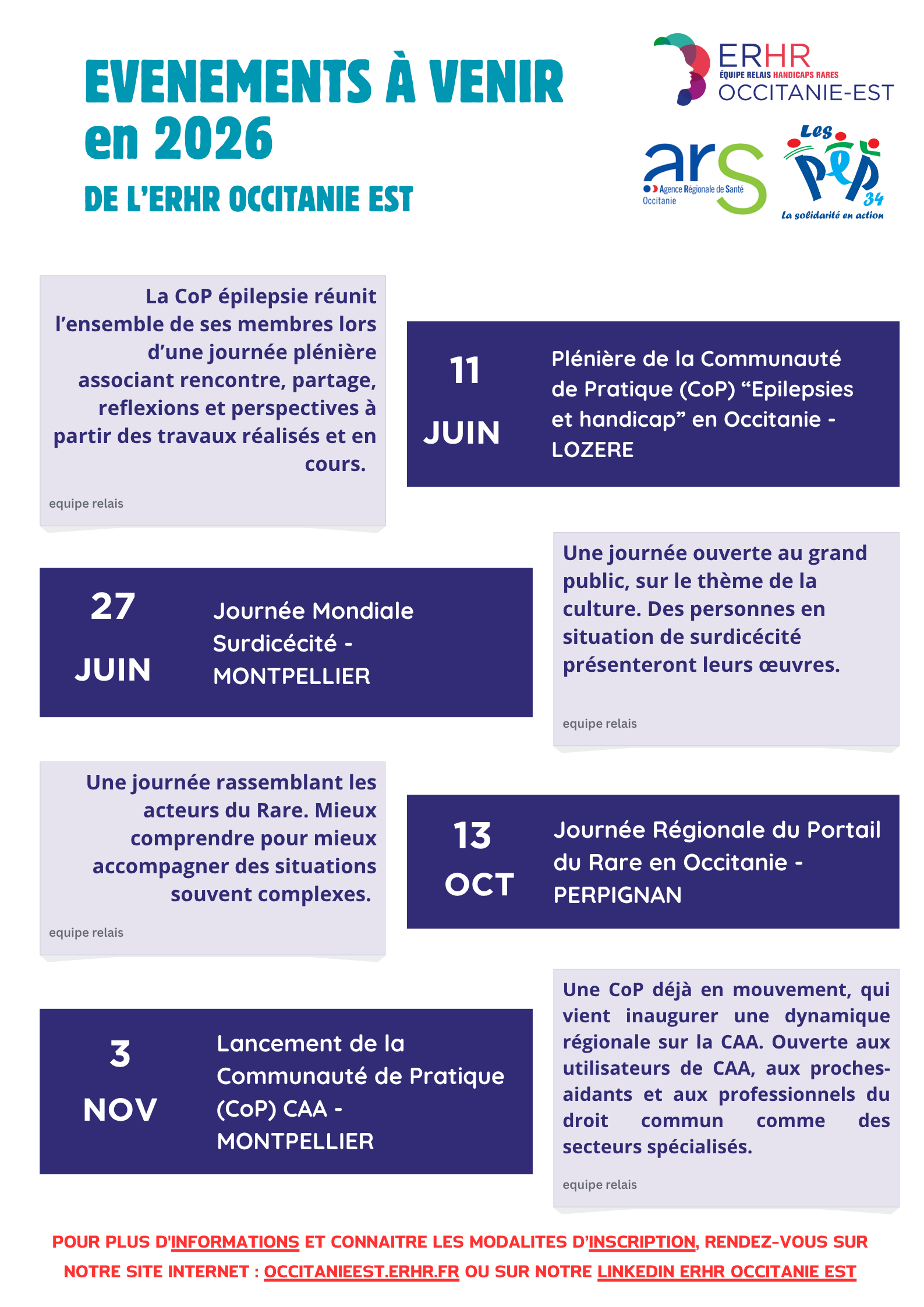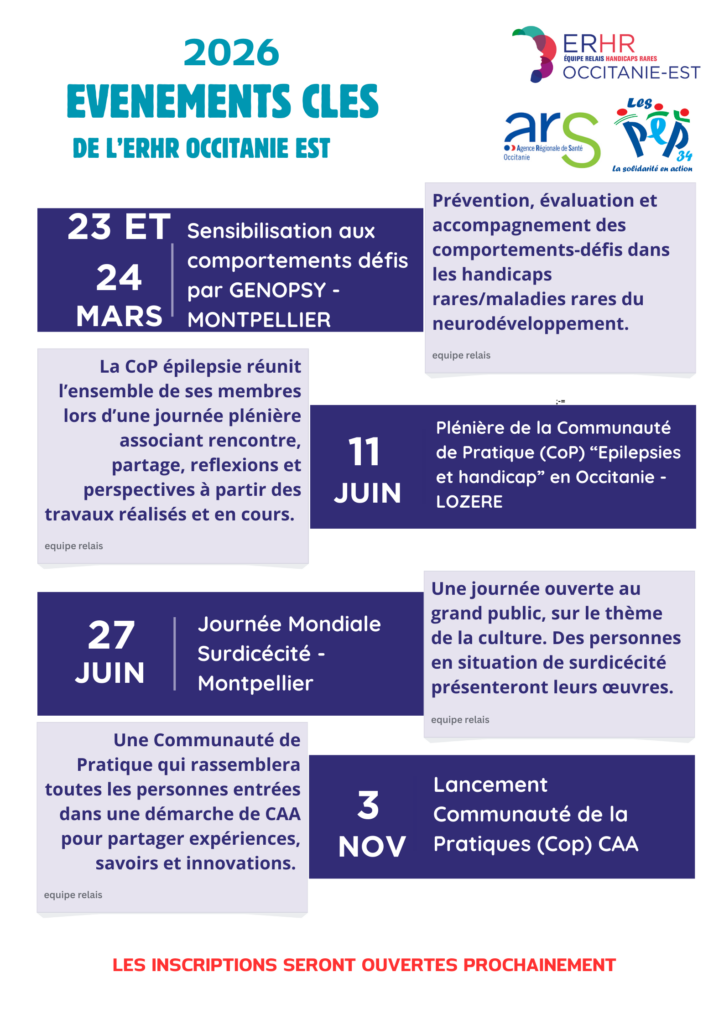 Afin que vous puissiez d’ors et déjà organiser votre agenda, voici les événements clés prévus par l’Équipe Relais Handicaps Rares Occitanie-Est pour l’année 2026.