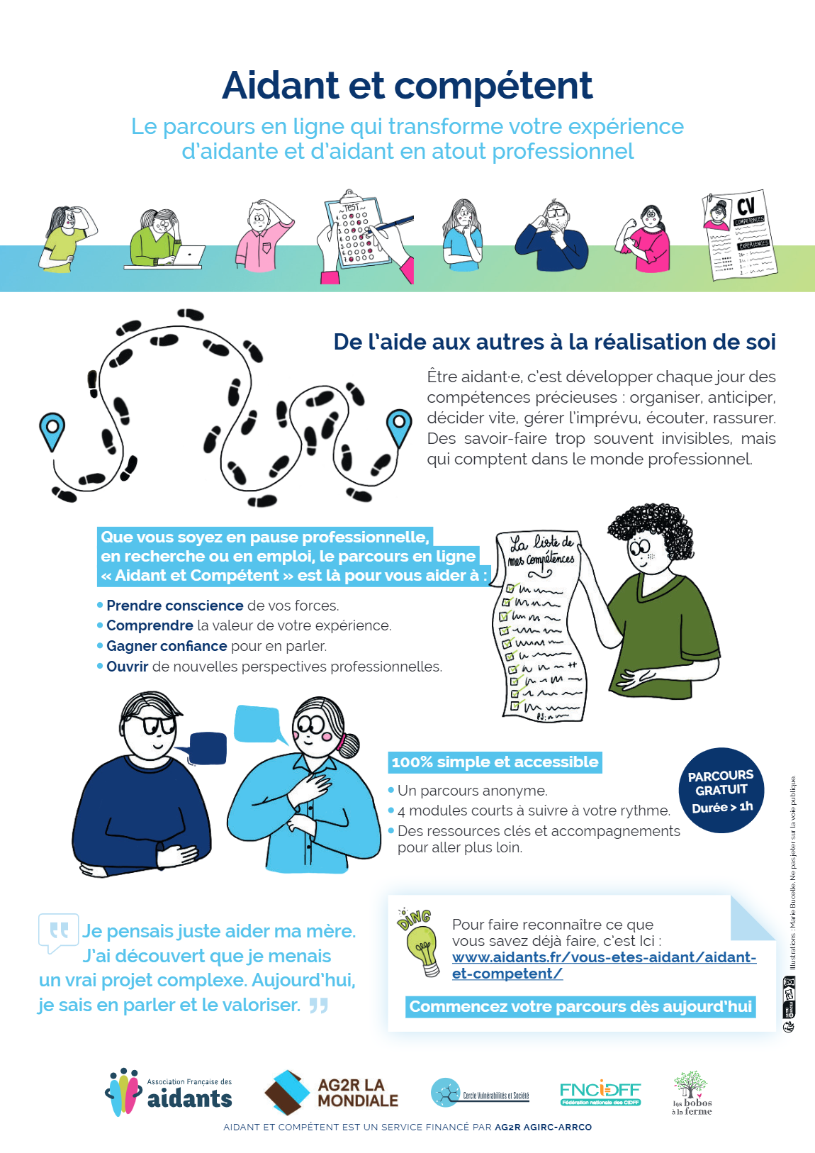 Parce que jongler entre responsabilités familiales et professionnelles développe sans toujours en avoir conscience de vraies compétences. Il s’agit ainsi de permettre aux proches aidantes et aidants de prendre conscience que leur situation personnelle leur confère une expérience qu’ils peuvent transformer en atout professionnel.
