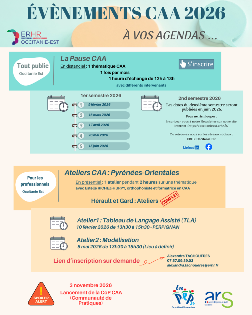 POUR LES PROFESSIONNELS – Les ateliers CAA accessibles, en présentiel, aux professionnels de l’Occitanie-Est, désireux de découvrir, de s’initier ou de partager leurs expériences sur les thématiques : Tableau de Langage Assisté (TLA) et Modélisation. Un espace ludique conçu pour allier théorie et mise en œuvre concrète ! Ces ateliers, qui sont complets, se poursuivent dans l’Hérault et le Gard. Ils vont démarrer pour Les professionnels de l’Aude et des Pyrénées-Orientales le 10 février 2026. Il reste encore quelques places.