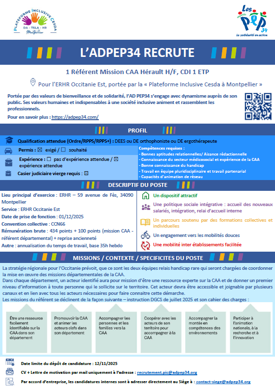 L’ADPEP34 Recrute pour l’Équipe Relais Handicaps Rares UN RÉFÉRENT MISSION CAA sur l’Hérault.